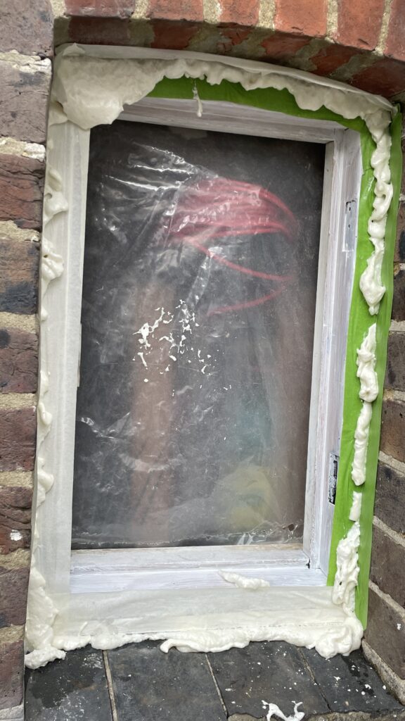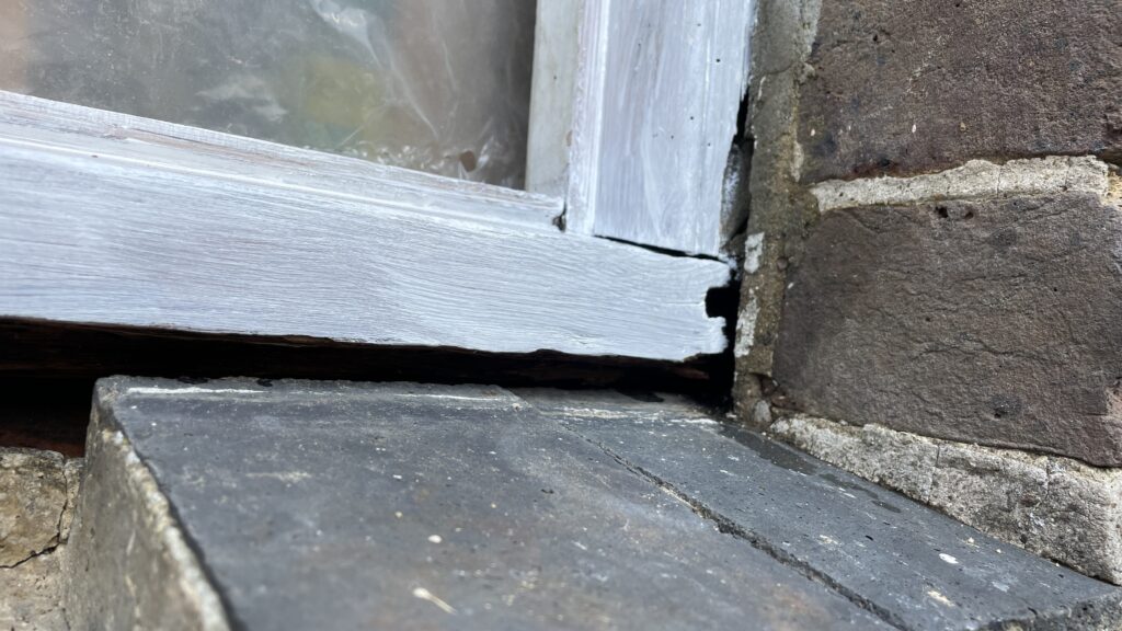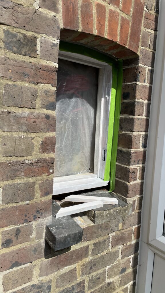 Touch and go with this one. Lots of rotten wood removed or treated, new wood scarfed in, other flaws filled, (large!) gaps around the frame filled with foam. All wood primed, undercoated and painted. New mortar applied to the frame surround. Should be good for another 100-odd years.